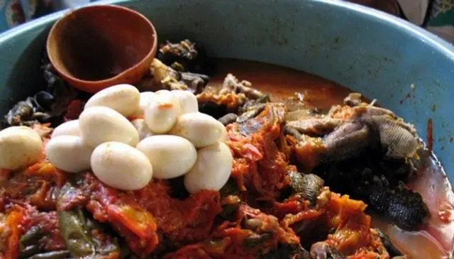 Primero se tiene que sacar las tripas de las iguanas y pasarlas por el fuego para poder descamarlo raspándolo con un cuchillo, después se parte en trozos (si la iguana tiene huevos, se limpian y se apartan con los trozos de iguana). En una cacerola se vierte dos litros de agua y se le agrega los trozos de iguana, ajo y sal al gusto; una vez que la iguana está hirviendo se le agrega el achiote y se exprimen los tomates triturándolas con las manos y se le agrega al caldo de iguana con los chiles que usted considere (en trozos o enteros).